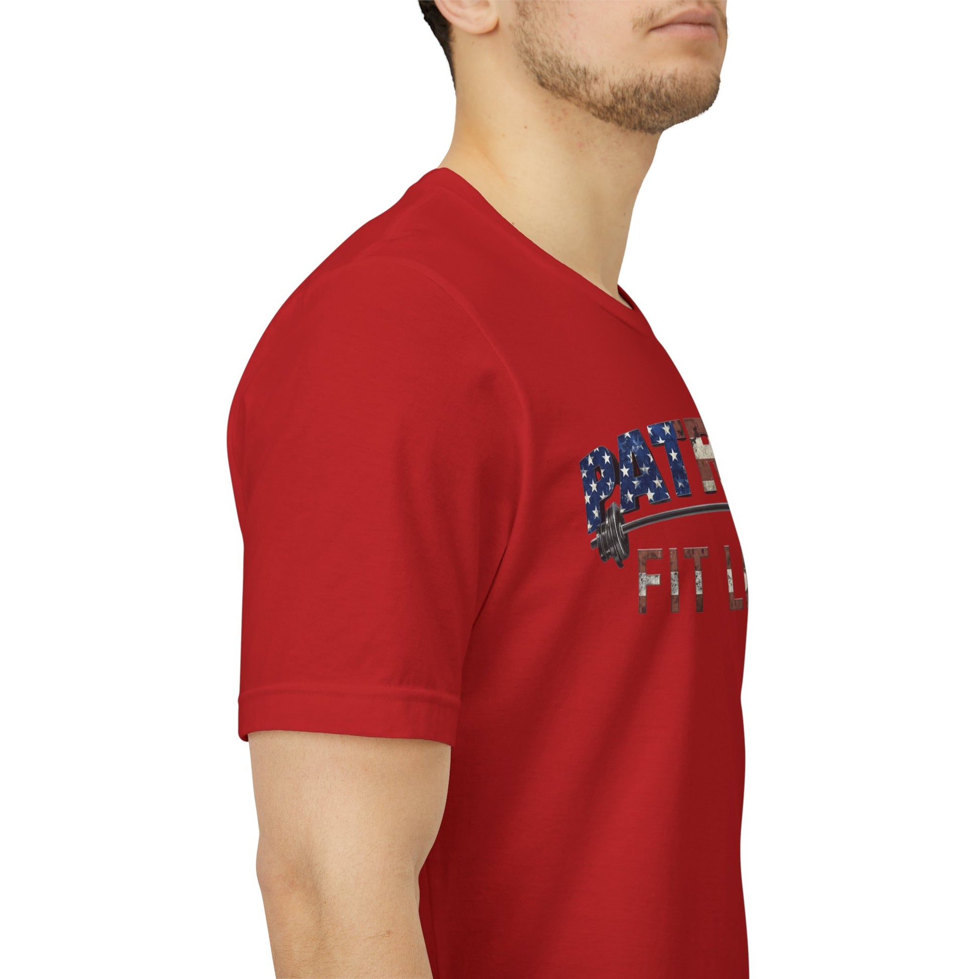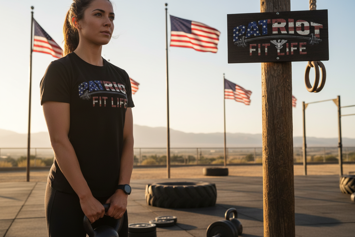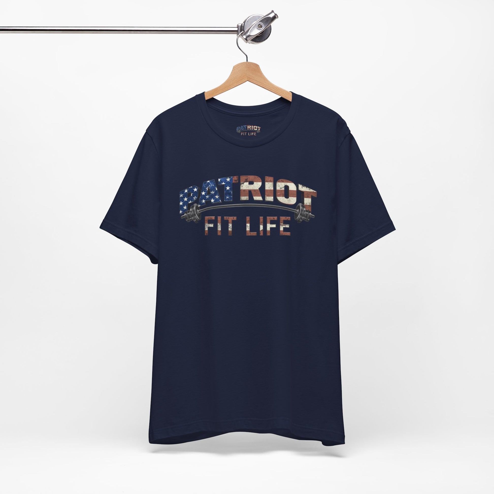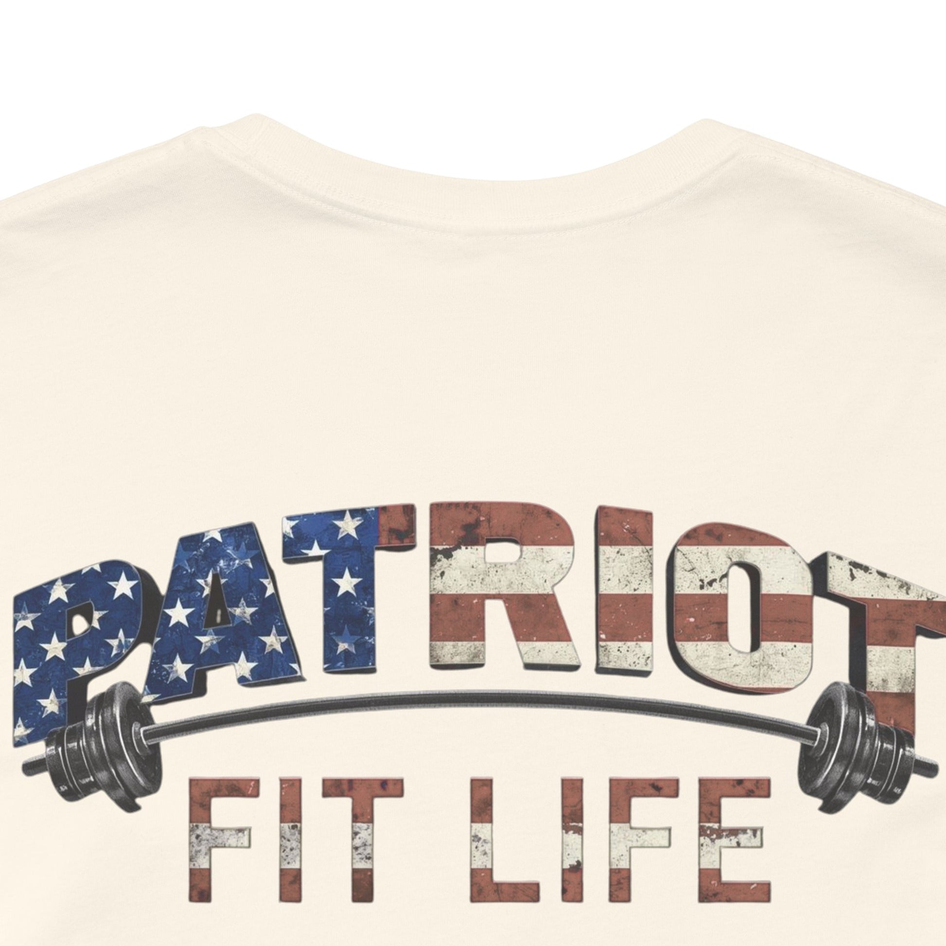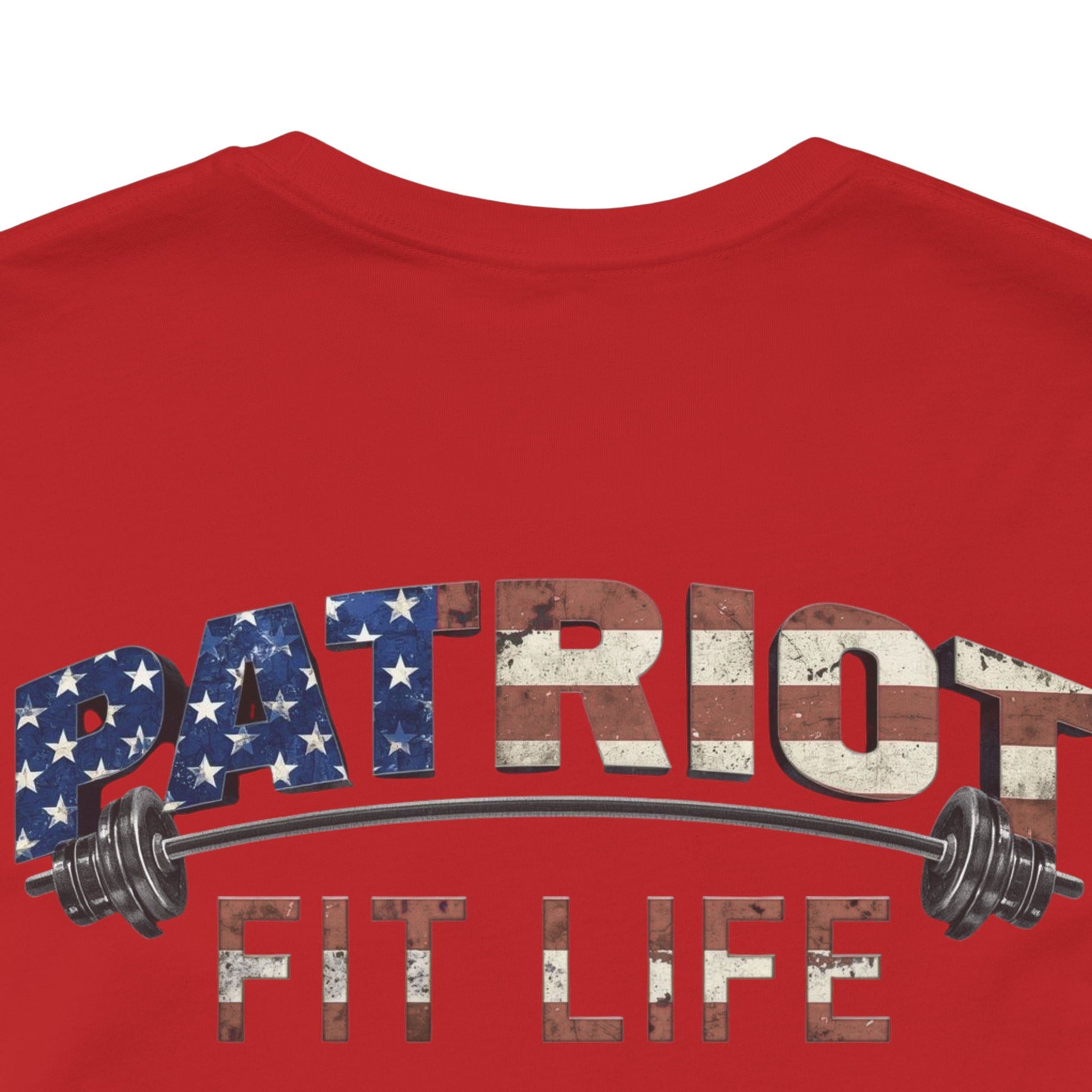 The eye-catching, flag-patterned "PATRIOT" wordmark with barbells and the "FIT LIFE" tagline makes a statement—you're committed to fitness, freedom, and the American spirit.