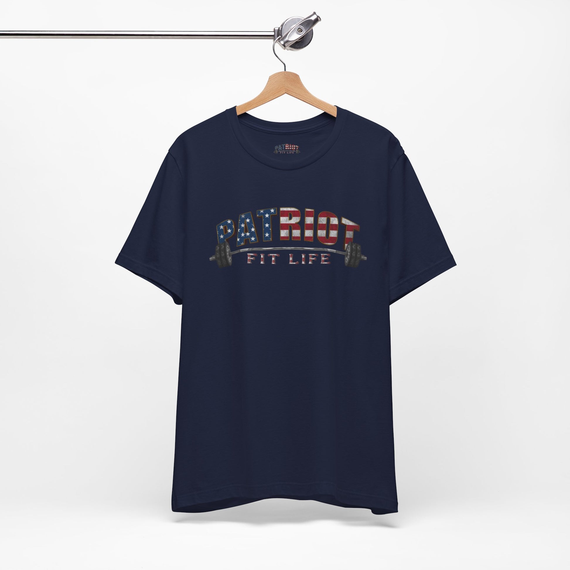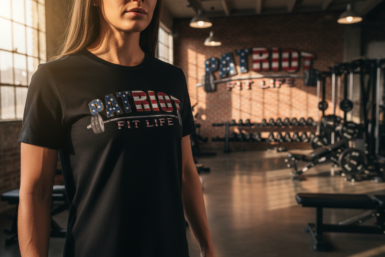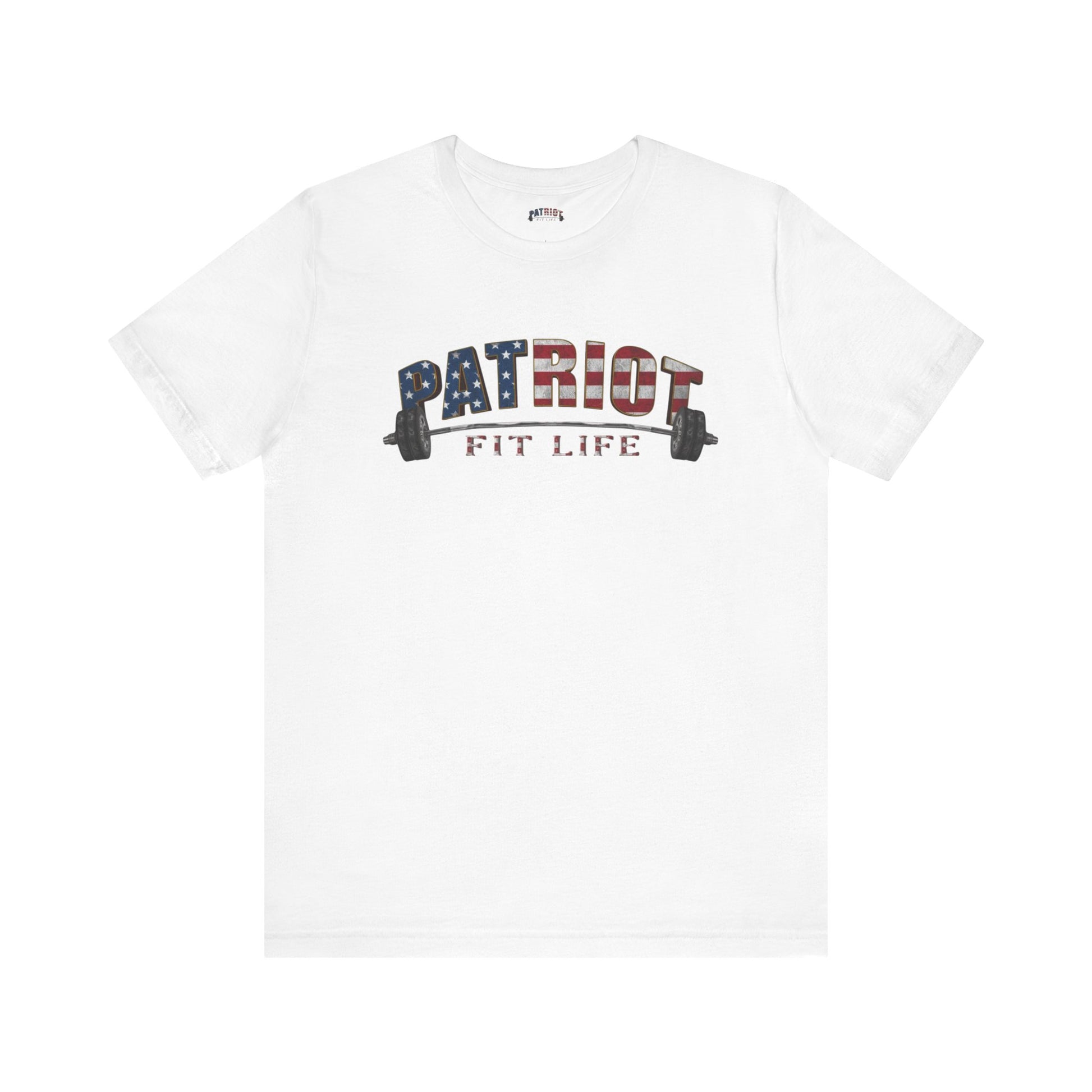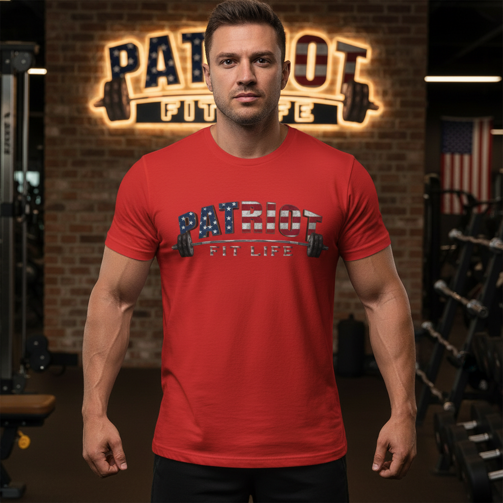 This clean, breathable gym tee is made to move with you through morning WODs, garage lifts, or post-run coffee stops. Featuring a distressed American flag "PATRIOT" graphic anchored by a barbell silhouette and "FIT LIFE" text on front and back, it delivers rugged, athletic style that fits seamlessly into your training wardrobe.